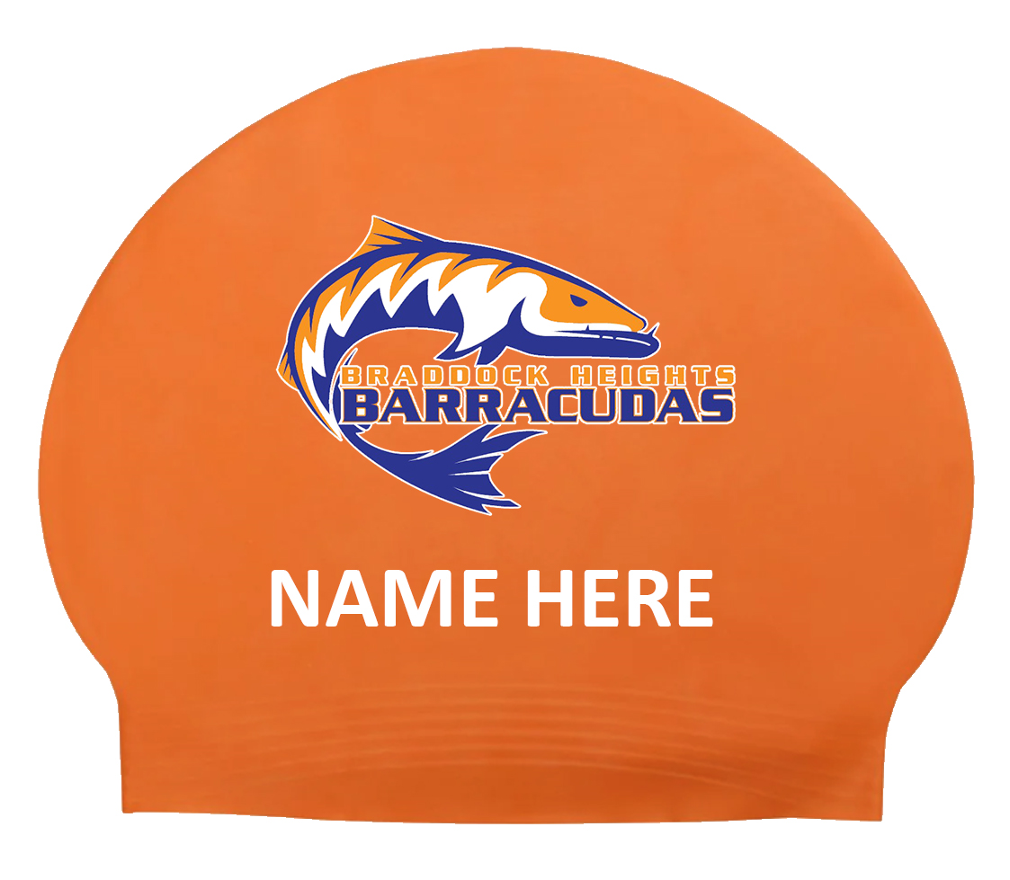 Two Braddock Heights Barracudas Silicone caps with a name on them.