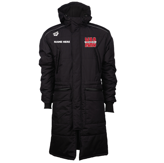 MAC is embroidered on the front of the arena Parka in white. Price includes swimmers name on the front in white block lettering.